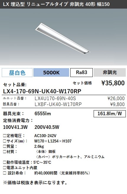 LX4-170-69N-UK40-W170RP ラインルクス 埋込型 リニューアルタイプ 非調光 40形 幅150