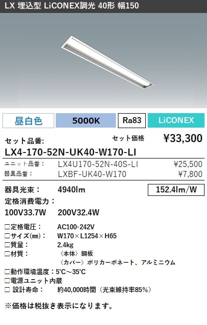 LX4-170-52N-UK40-W170-LI ラインルクス 埋込型 LiCONEX調光 40形 幅150