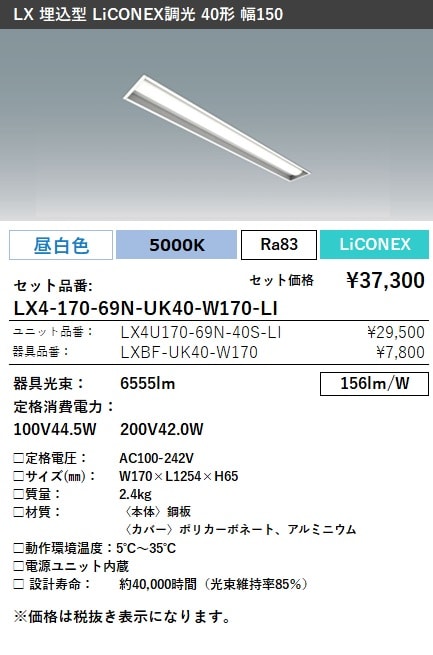 LX4-170-69N-UK40-W170-LI ラインルクス 埋込型 LiCONEX調光 40形 幅150
