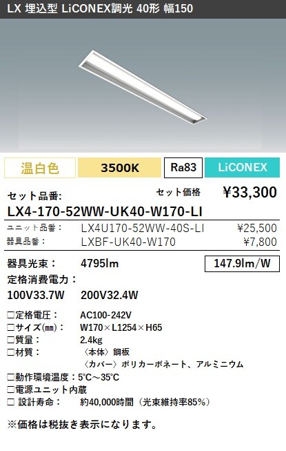 LX4-170-52WW-UK40-W170-LI ラインルクス 埋込型 LiCONEX調光 40形 幅150