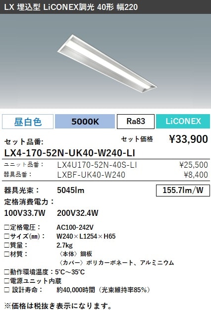 LX4-170-52W-UK40-W240-LI ラインルクス 埋込型 LiCONEX調光 40形 幅220