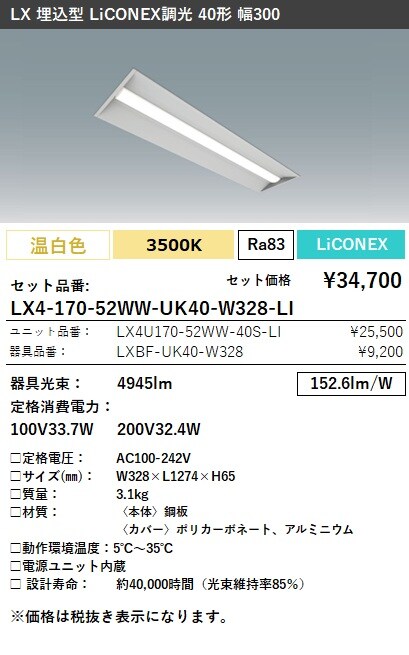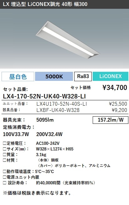 LX4-170-52W-UK40-W328-LI ラインルクス 埋込型 LiCONEX調光 40形 幅300