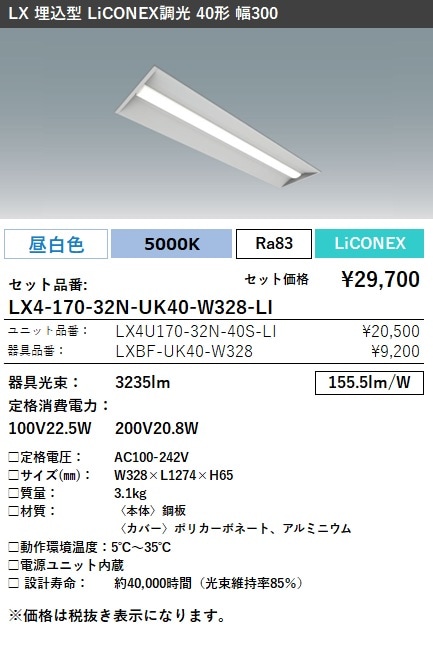 LX4-170-32W-UK40-W328-LI ラインルクス 埋込型 LiCONEX調光 40形 幅300