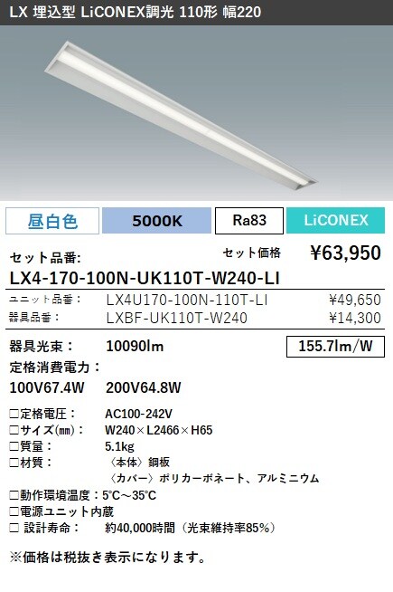 LX4-170-100W-UK110T-W240-LI ラインルクス 埋込型 LiCONEX調光 110形 幅220
