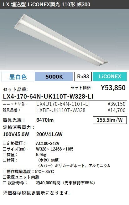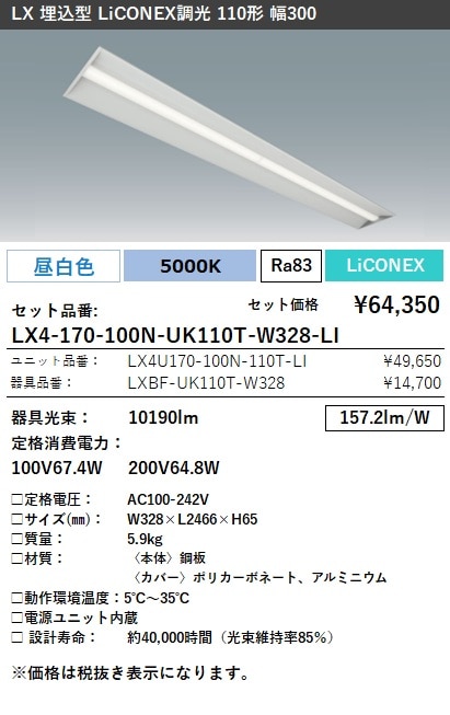 LX4-170-64W-UK110T-W328-LI ラインルクス 埋込型 LiCONEX調光 110形 幅300