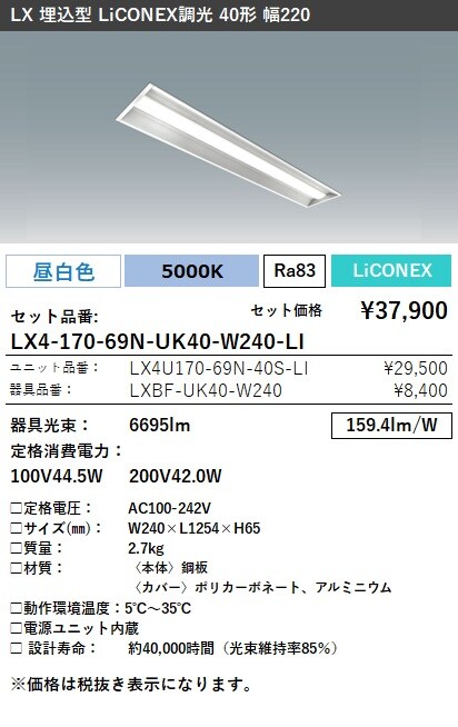 LX4-170-69W-UK40-W240-LI ラインルクス 埋込型 LiCONEX調光 40形 幅220