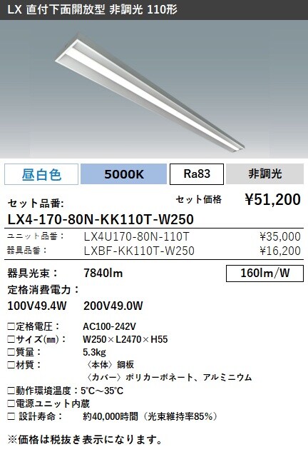 LX4-170-80N-KK110T-W250 ラインルクス 直付下面開放型 非調光 110形