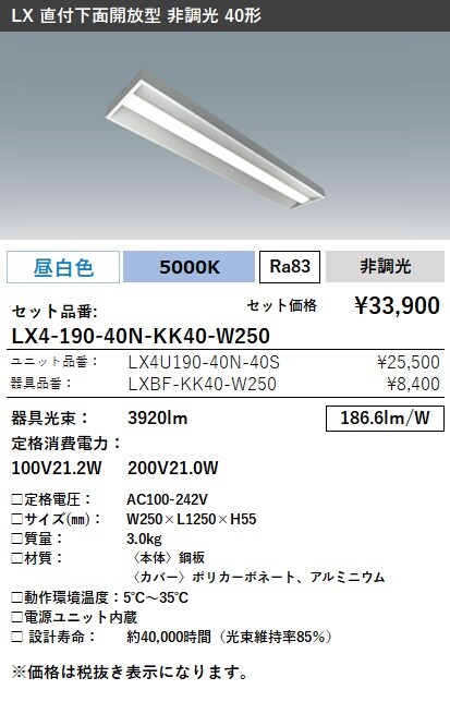 LX4-190-40W-KK40-W250        ラインルクス 直付下面開放型 非調光 40形