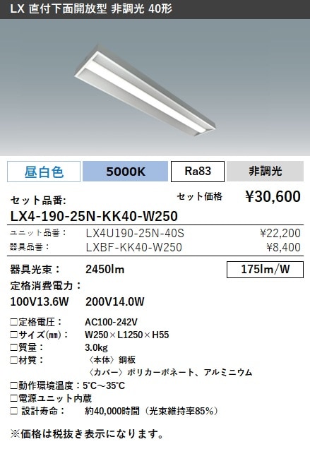 LX4-190-25W-KK40-W250 ラインルクス 直付下面開放型 非調光 40形