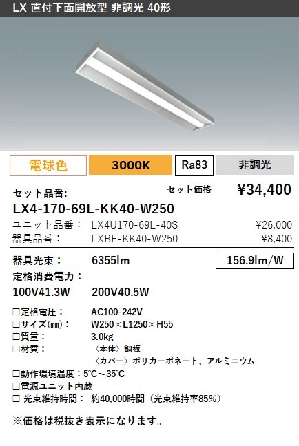 LX4-170-69L-KK40-W250 ラインルクス 直付下面開放型 非調光 40形