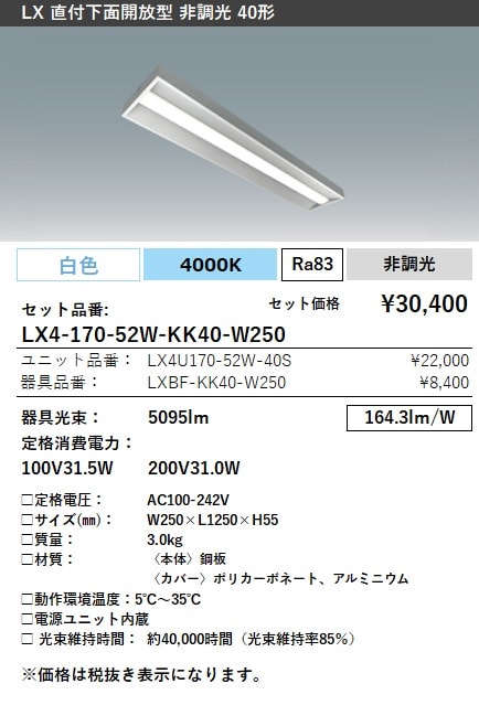LX4-170-52W-KK40-W250 ラインルクス 直付下面開放型 非調光 40形