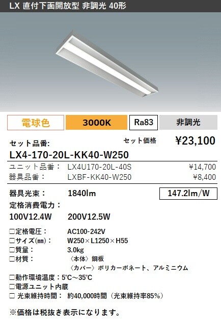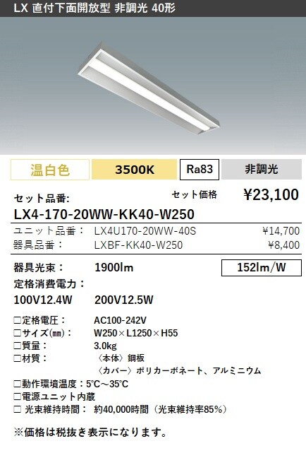 LX4-170-20WW-KK40-W250 ラインルクス 直付下面開放型 非調光 40形