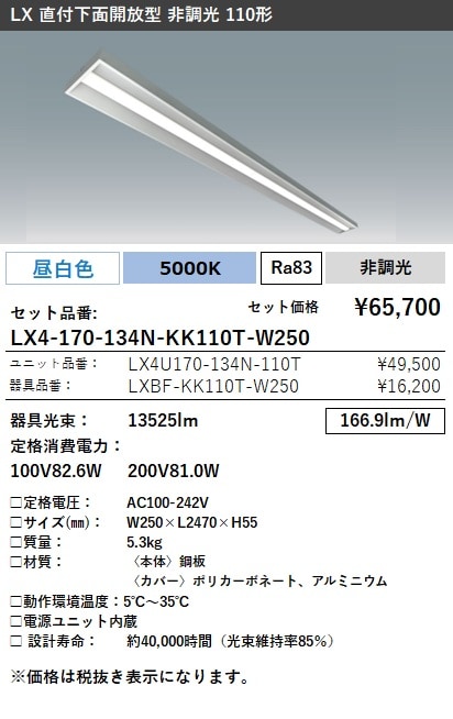 LX4-170-134WW-KK110T-W250 ラインルクス 直付下面開放型 非調光 110形