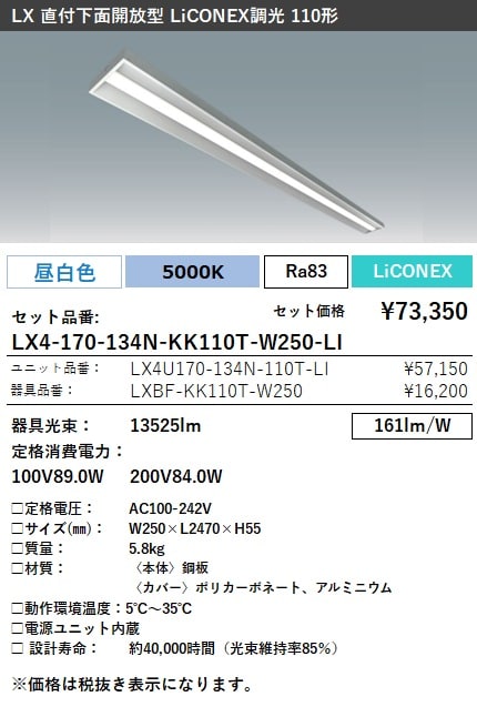 LX4-170-134N-KK110T-W250-LI ラインルクス 直付下面開放型 LiCONEX調光 110形