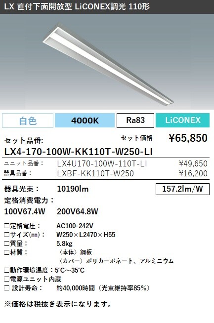 LX4-170-100WW-KK110T-W250-LI ラインルクス 直付下面開放型 LiCONEX調光 110形
