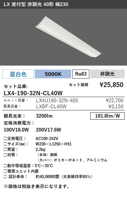 LX4-190-32W-CL40W ラインルクス 直付型 非調光 40形 幅230