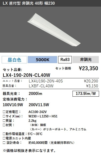 LX4-190-20N-CL40W ラインルクス 直付型 非調光 40形 幅230