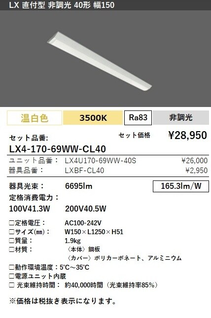 LX4-170-69N-CL40 ラインルクス 直付型 非調光 40形 幅150