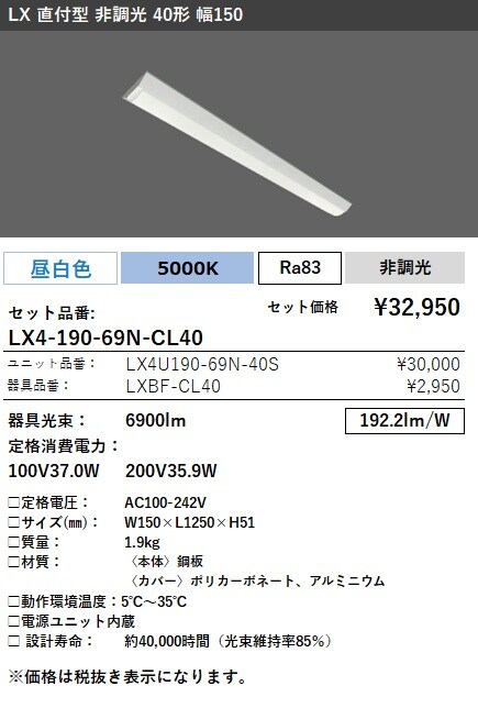 LX4-190-69N-CL40 ラインルクス 直付型 非調光 40形 幅150
