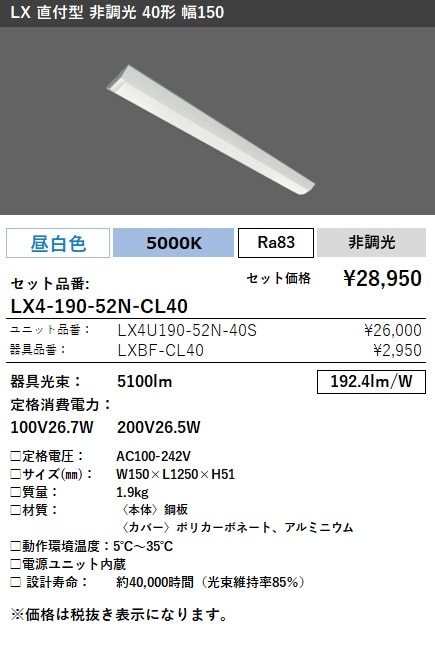 LX4-190-52N-CL40 ラインルクス 直付型 非調光 40形 幅150