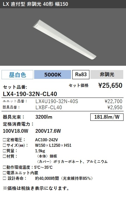 LX4-190-32W-CL40 ラインルクス 直付型 非調光 40形 幅150
