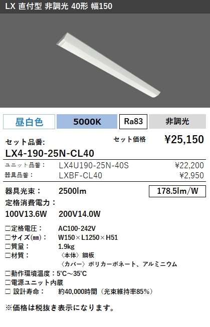 LX4-190-25N-CL40 ラインルクス 直付型 非調光 40形 幅150