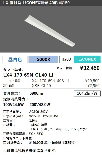 LX4-170-69N-CL40-LI ラインルクス 直付型 LiCONEX調光 40形 幅150