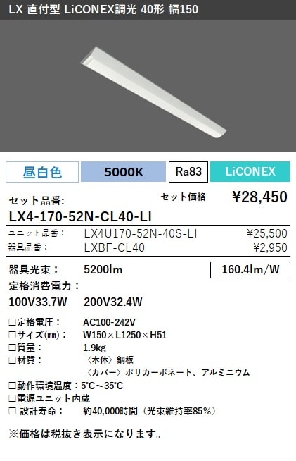LX4-170-52N-CL40-LI ラインルクス 直付型 LiCONEX調光 40形 幅150