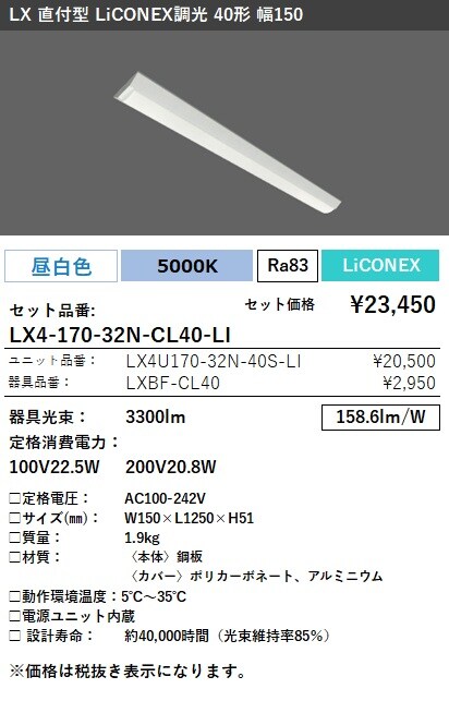 LX4-170-32L-CL40-LI ラインルクス 直付型 LiCONEX調光 40形 幅150