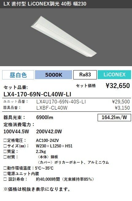 LX4-170-69W-CL40W-LI ラインルクス 直付型 LiCONEX調光 40形 幅230
