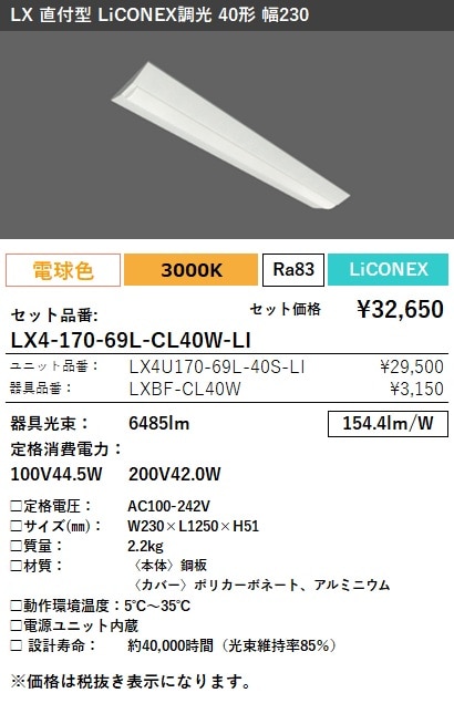 LX4-170-69L-CL40W-LI ラインルクス 直付型 LiCONEX調光 40形 幅230