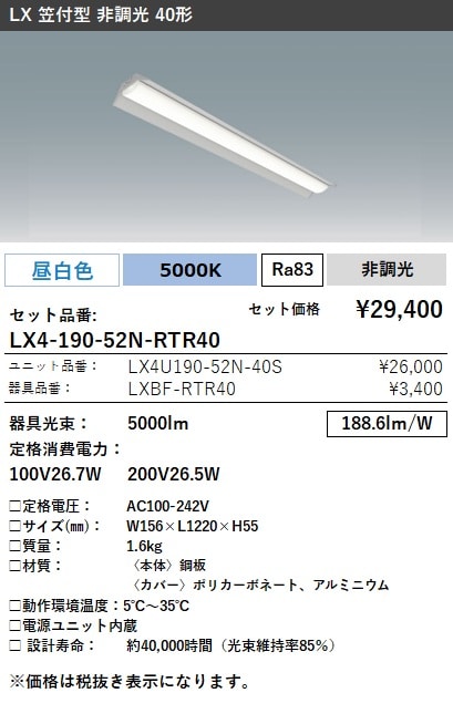LX4-190-52N-RTR40 ラインルクス 笠付型 非調光 40形