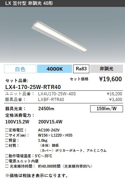 LX4-170-25WW-RTR40 ラインルクス 笠付型 非調光 40形