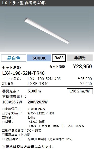 LX4-190-52W-TR40 ラインルクス トラフ型 非調光 40形