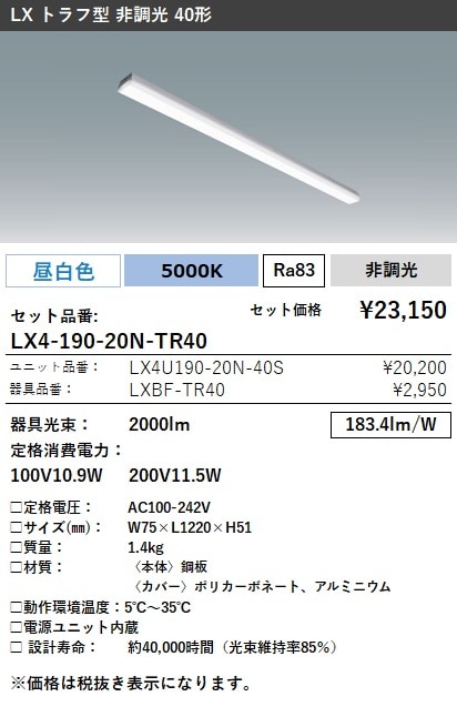 LX4-190-20N-TR40 ラインルクス トラフ型 非調光 40形