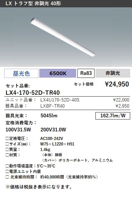 LX4-170-52W-TR40 ラインルクス トラフ型 非調光 40形