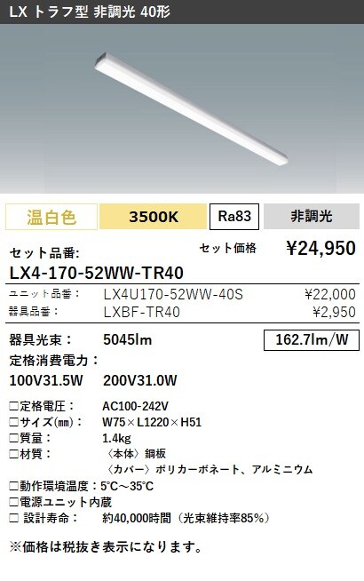 LX4-170-52WW-TR40 ラインルクス トラフ型 非調光 40形