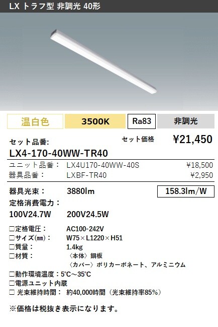 LX4-170-40WW-TR40 ラインルクス トラフ型 非調光 40形