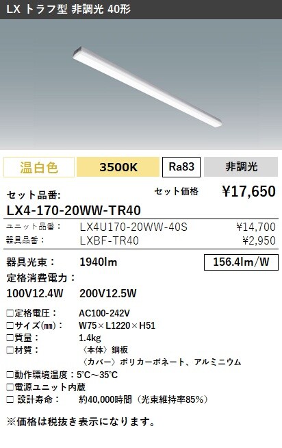 LX4-170-20WW-TR40 ラインルクス トラフ型 非調光 40形