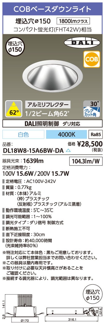 DL18L28-15A6BW-DA LEDベースダウンライトφ150 DALI調光