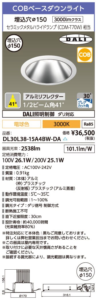 DL30L38-15A4BW-DA LEDベースダウンライトφ150 DALI調光
