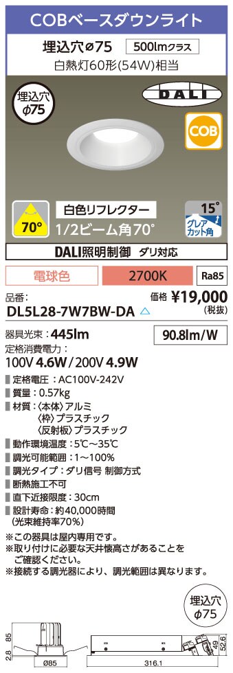 DL5L28-7W7BW-DA LEDベースダウンライトφ75 DALI調光