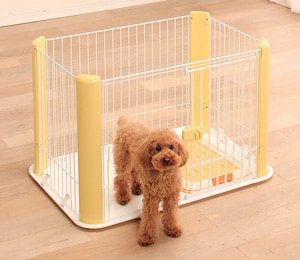 従来のサークルは「スチールのみ」と「木材とスチールの組み合わせ」の2種類が主流でしたが、“カラーサークル”は支柱にプラスチックを使用することで「ポップなカラー」という今までに無い新しい特長を備えています。チワワ、トイプードルなど小型犬の可愛らしい雰囲気をより引き立てることができます。
