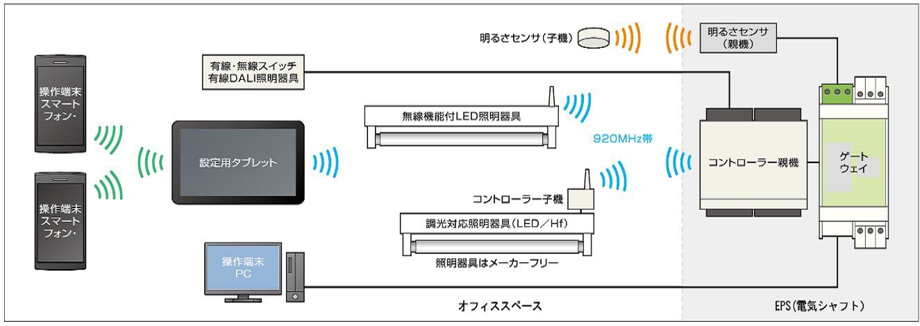 NTTファシリティーズ、株式会社メガチップス(本社:大阪市淀川区、代表取締役社長:髙田 明)、日比谷総合設備株式会社(本社:東京都港区、代表取締役社長:野村 春紀)、アイリスオーヤマの4社が共同開発を行い、2015年1月5日より提供を開始した無線個別調光照明制御システムです。オフィスや施設などの照明をスマートフォンや、タブレット端末から無線により制御する事が可能です。一灯ごとに自動及び手動での制御が可能なため、不在時に自分の席のみを消灯する、室内を部分的に明るくするなどシーンにあわせたきめ細やかな照明制御が可能になります。また、携帯端末からの無線制御であるため配線工事が不要となり改修工事などの際にも導入がしやすくなっています。