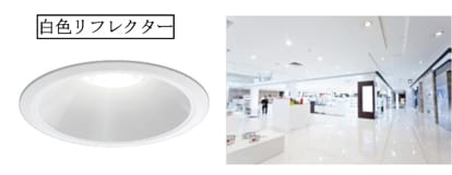 また、リフレクター※2の材質、明るさ、埋込穴、色温度などの組み合わせにより、全380種類のラインアップから目的や用途に応じて幅広く選択できます。アルミリフレクターはグレアカット※3を深く設定することで光源が見えにくく、明るさを確保しながらまぶしさを感じにくいのが特長で、レストランやカフェ、ホテルのエントランスなどの落ち着いた空間に適しています。白色リフレクターは光を適度に拡散反射させて華やかで明るい空間を演出できるので、商業施設やアミューズメント施設などに適しています。埋込穴径は75mm、100mm、150mmの3種類、色温度は2700K〜5000Kの5段階、明るさは400ml〜5300lmクラスで展開※4するため、フロアの天井高や照度に合わせて選択でき、建物全体に統一感を与えます。