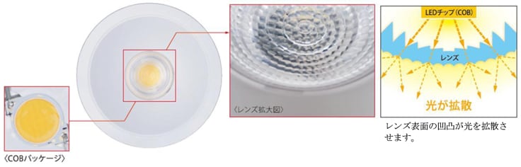 さらに、シングルコアタイプの光源に特殊な凹凸を施した独自のレンズを組み合わせることで光を拡散させ、ムラのない自然な光を実現しています。