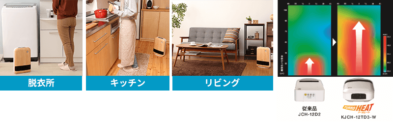 従来品のモーターとファンの変更と風路設計を見直したことで、温風の到達距離2.3倍※を実現しています。これにより、足元やトイレなど狭い空間はもちろんリビングや寝室など広い空間での使用にも対応可能です。