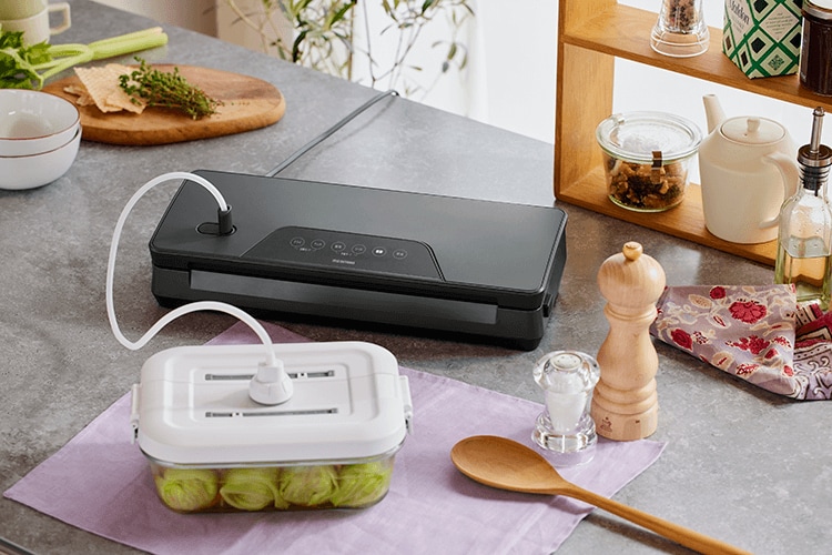 今回発売する「真空パック機」は、専用袋や専用容器の中を真空※2内容物を密封して保存できます。食材を冷蔵・冷凍した際の冷凍焼けや酸化による変色、傷み、乾燥を防げるので、食感や風味、鮮度を保ちます※1。また真空パックにした食材は、サイズもコンパクトで、冷蔵庫・冷凍庫内部のスペースを確保できます。さらに大容量の食材や開封後に全てを消費しきれなかった菓子も小分けにして密封保存できます※3。