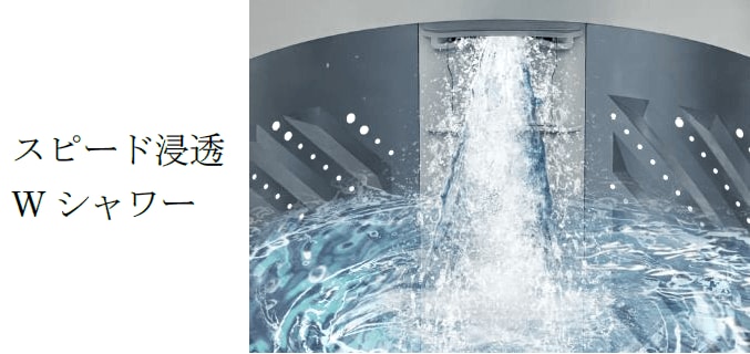 衣類の量に合わせて、高低2つの吐出口のどちらかを自動で選択して槽内にシャワーを出す「スピード浸透Wシャワー」が衣類を素早く濡らして洗剤を浸透させます。従来品※5より容量が約10%UPした新設計の広い洗濯槽と山形の「極渦パルセーター」により、大きな羽で水をしっかり攪拌し、衣類の動きをスムーズにすることでこすり洗いを促進します。立体水流で油汚れやシミ汚れ、泥汚れなど頑固な汚れもしっかり落とします。