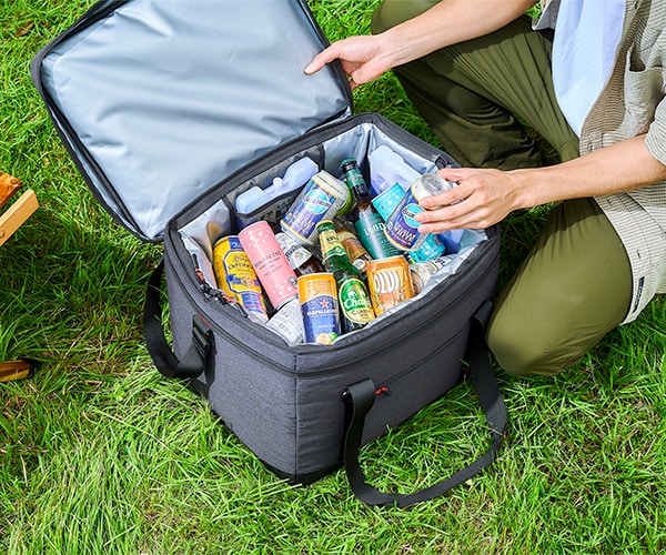 - ※1:当社ソフトクーラーボックス保冷性能の自社基準において。40Lの場合。本体容量40%の相当の氷を入れ、底面温度が8℃に達するまでの時間。環境温度は30℃9h―20℃15hの繰り返し。(実際の使用状況、環境等によって保冷力は異なります。)